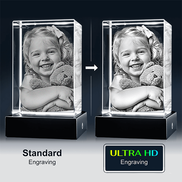 And, you can add either a simple Plastic LED Light Base or go all out an add a Wood LED Light Base with Color-Changing Lights to make the engraving in your 3D Crystal stand out!